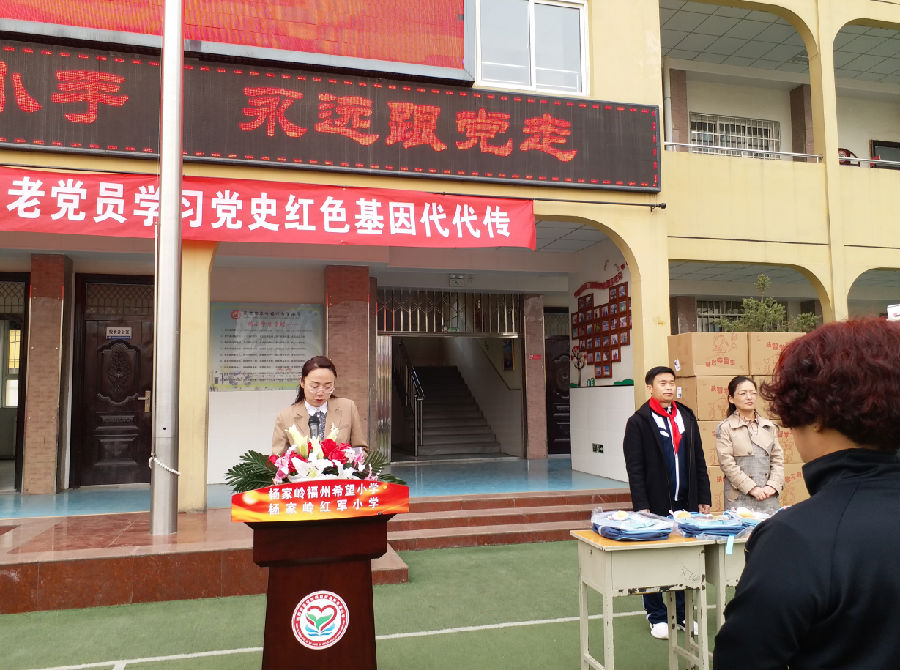 28日早上8:00,大家拉上“扶智学习包及学习用品”一起驱车来到杨家岭福州希望小学,该校位于杨家岭革命旧址旁,作为革命圣地的这所学校,恰逢校舍正在施工修缮,现场拉起条幅“大手拉小手 永远跟党走”,杨家岭学校工会主席 蔺玉玲 致欢迎词;学生代表向嘉宾佩戴红领巾;全国广场舞培训推广委员会执行主任 张杰 代表主办方讲话;全国广场舞党员代表崔瑞仙 发言。